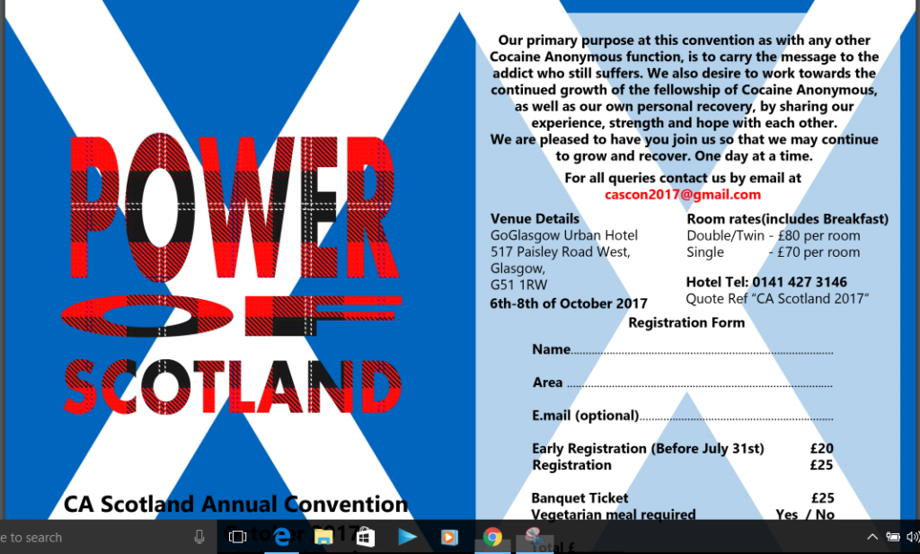 Disclaimer: Some of the items contained in these pages are published with permission of CA World Services, Inc., this does not imply endorsement of the web site by the CA World Service Conference or the CA World Service Office. The information provided within this site is intended to be a convenience for those who visit our site. Such inclusion does not constitute or imply any endorsement, by or affiliation with, the CA Scotland Area.