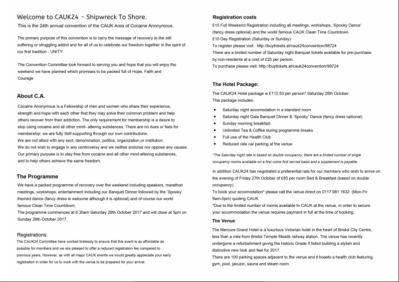 Disclaimer: Some of the items contained in these pages are published with permission of CA World Services, Inc., this does not imply endorsement of the web site by the CA World Service Conference or the CA World Service Office. The information provided within this site is intended to be a convenience for those who visit our site. Such inclusion does not constitute or imply any endorsement, by or affiliation with, the CA Scotland Area.