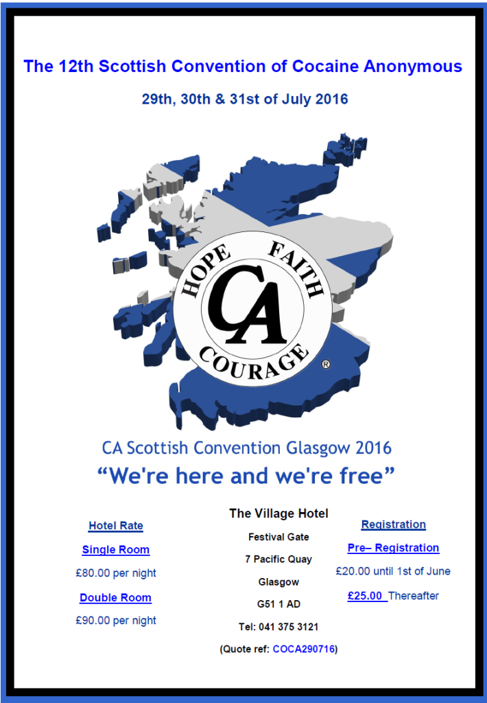 Disclaimer: Some of the items contained in these pages are published with permission of CA World Services, Inc., this does not imply endorsement of the web site by the CA World Service Conference or the CA World Service Office. The information provided within this site is intended to be a convenience for those who visit our site. Such inclusion does not constitute or imply any endorsement, by or affiliation with, the CA Scotland Area.