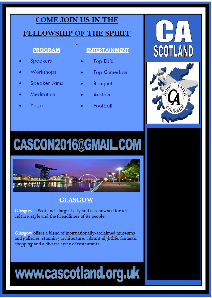 Disclaimer: Some of the items contained in these pages are published with permission of CA World Services, Inc., this does not imply endorsement of the web site by the CA World Service Conference or the CA World Service Office. The information provided within this site is intended to be a convenience for those who visit our site. Such inclusion does not constitute or imply any endorsement, by or affiliation with, the CA Scotland Area.