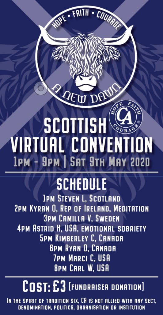 Disclaimer: Some of the items contained in these pages are published with permission of CA World Services, Inc., this does not imply endorsement of the web site by the CA World Service Conference or the CA World Service Office. The information provided within this site is intended to be a convenience for those who visit our site. Such inclusion does not constitute or imply any endorsement, by or affiliation with, the CA Scotland Area.