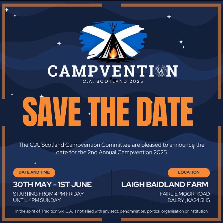 Disclaimer: Some of the items contained in these pages are published with permission of CA World Services, Inc., this does not imply endorsement of the web site by the CA World Service Conference or the CA World Service Office. The information provided within this site is intended to be a convenience for those who visit our site. Such inclusion does not constitute or imply any endorsement, by or affiliation with, the CA Scotland Area.